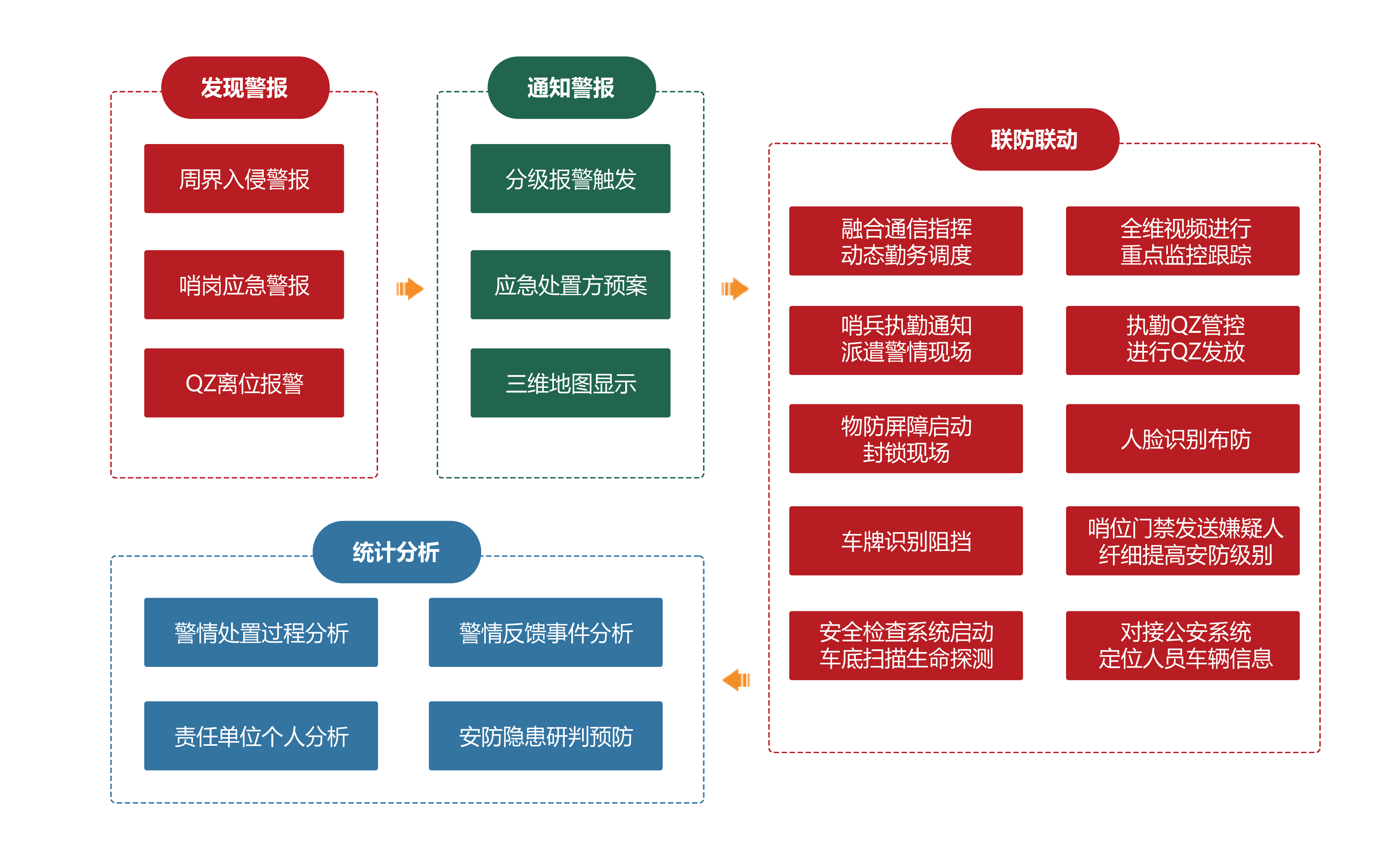 全方位立體式還原院區實貌,分圖層對院區的區域、建筑、單位、安防設備、管理設備、警情等進行查看、監控和跟蹤;通過院區各類安防管理設備實時獲取各重點監控區域的監控數據,對各種突發事件進行報警。通過人臉識別、車牌識別、行為識別、武器管理、營區設備等各類傳感器,對人、車、物及其行為的全面感知,保障營區安全。 -